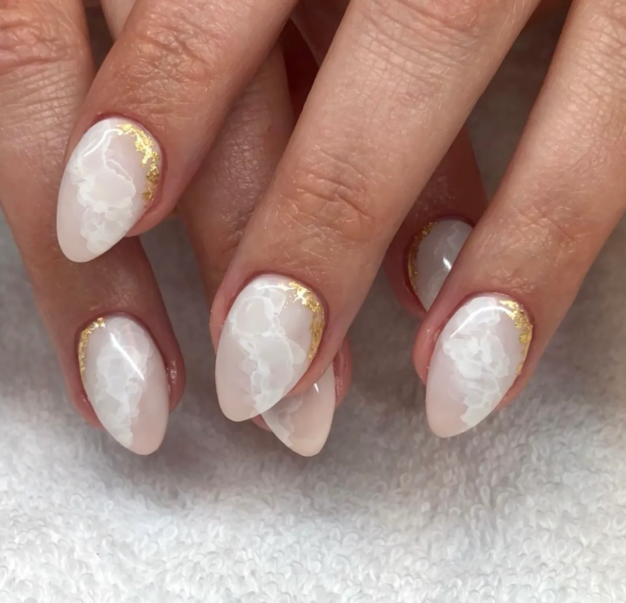 Αυτό το μανικιούρ είναι τέλειο για εσάς που αγαπάτε τα ιδιαίτερα nail art σχέδια που θυμίζουν μάρμαρο! Μας αρέσει πολύ ο φυσικός τόνος του ροζ με το λευκό και η λεπτομέρεια με τα φύλλα χρυσού.