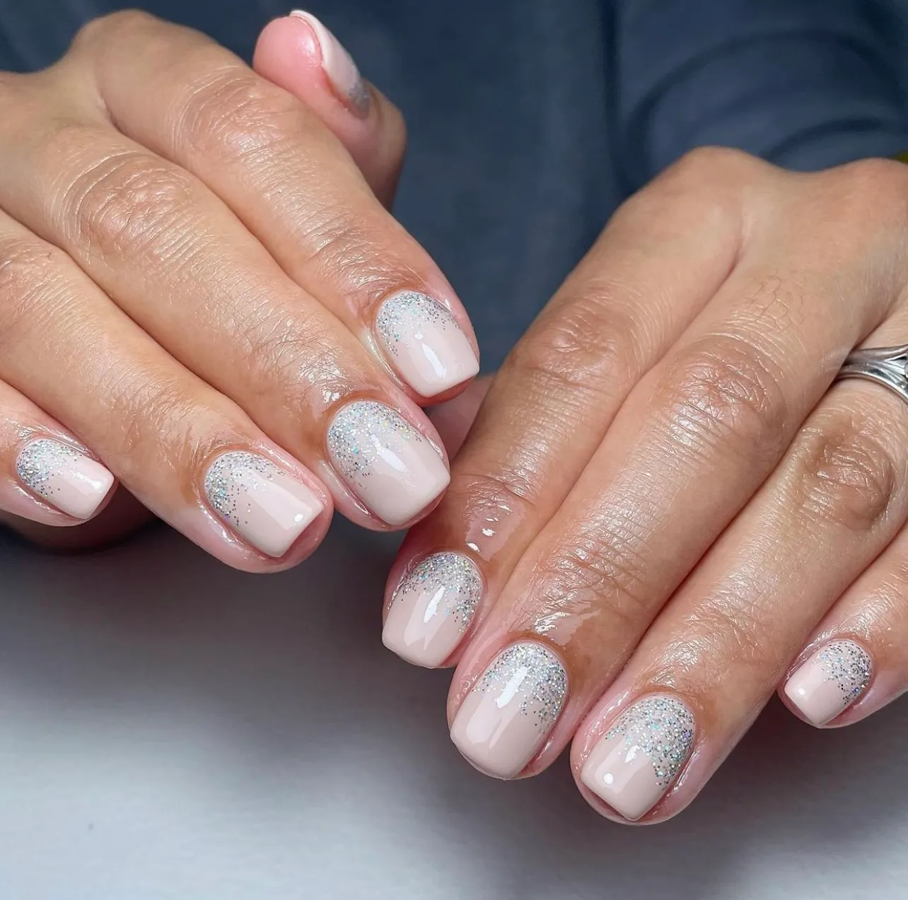 Αυτή είναι άλλη μία κλασική αλλά λίγο διαφορετική επιλογή! Κοντά squoval νύχια βαμμένα με ένα υπέροχο ροζέ γαλακτερό χρώμα και λεπτομέρειες με ασημί γκλίτερ. Θα ταιριάζει τέλεια αν έχετε επιλέξει ένα νυφικό με λάμψη!
