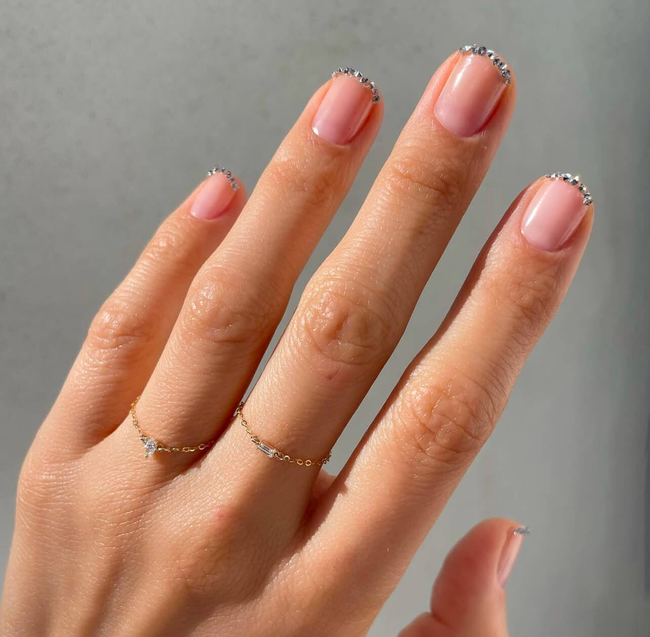 Αν αναρωτιέστε τι είναι τα στέμματα νυχιών, σκεφτείτε τα ως μια πολυτελή παραλλαγή του γαλλικού μανικιούρ. Αντί για το κλασικό άσπρο ή χρωματιστό tip, τα στέμματα νυχιών έχουν μικρά πετράδια στη γραμμή του χαμόγελου του νυχιού (εκεί που ξεκινά το λευκό χρώμα της άκρης).