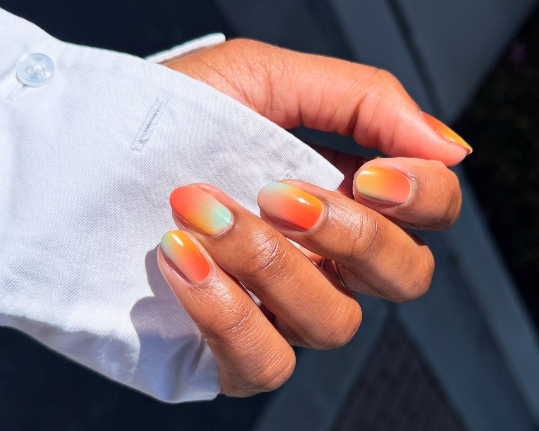 Έντονο, ζεστό και λαμπερό σαν ηλιοβασίλεμα, αυτό το μανικιούρ αποτελεί την έμπνευση για ένα όμπρε που συνδυάζει αρμονικά τα χρώματα. Κάθε απόχρωση κυλάει απαλά στην επόμενη, προσφέροντας μια φρέσκια και εντυπωσιακή εκδοχή του εφέ ombré.
