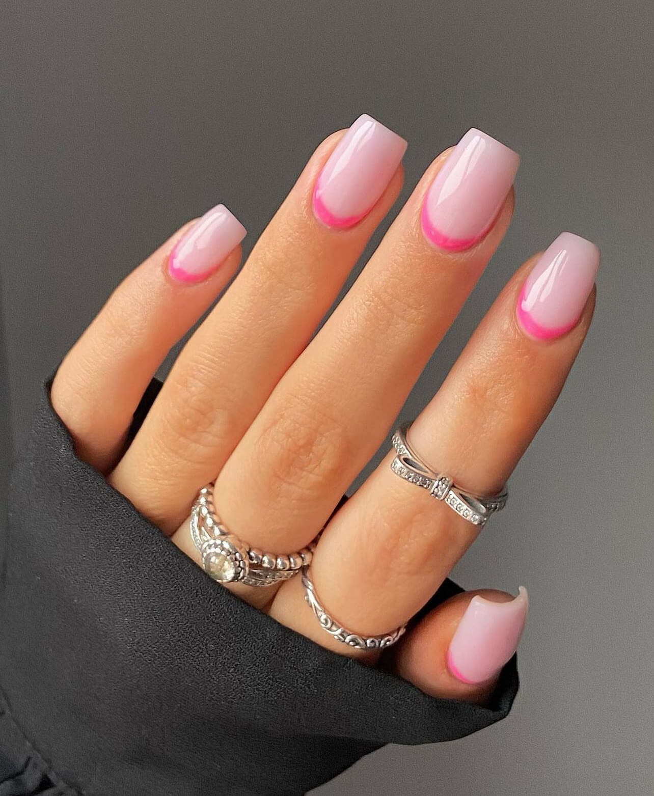 Το μαύρο σε διάφανη βάση είναι η επιτομή του μίνιμαλ και του chic. Η σκούρα βάση στη ρίζα των νυχιών τονίζει τη γραμμή του μανικιούρ χωρίς να χρειάζεται τίποτα παραπάνω. Αυτό το σχέδιο δίνει μια αίσθηση δυναμισμού και κομψότητας που ταιριάζει τόσο σε casual όσο και σε πιο επίσημες εμφανίσεις.