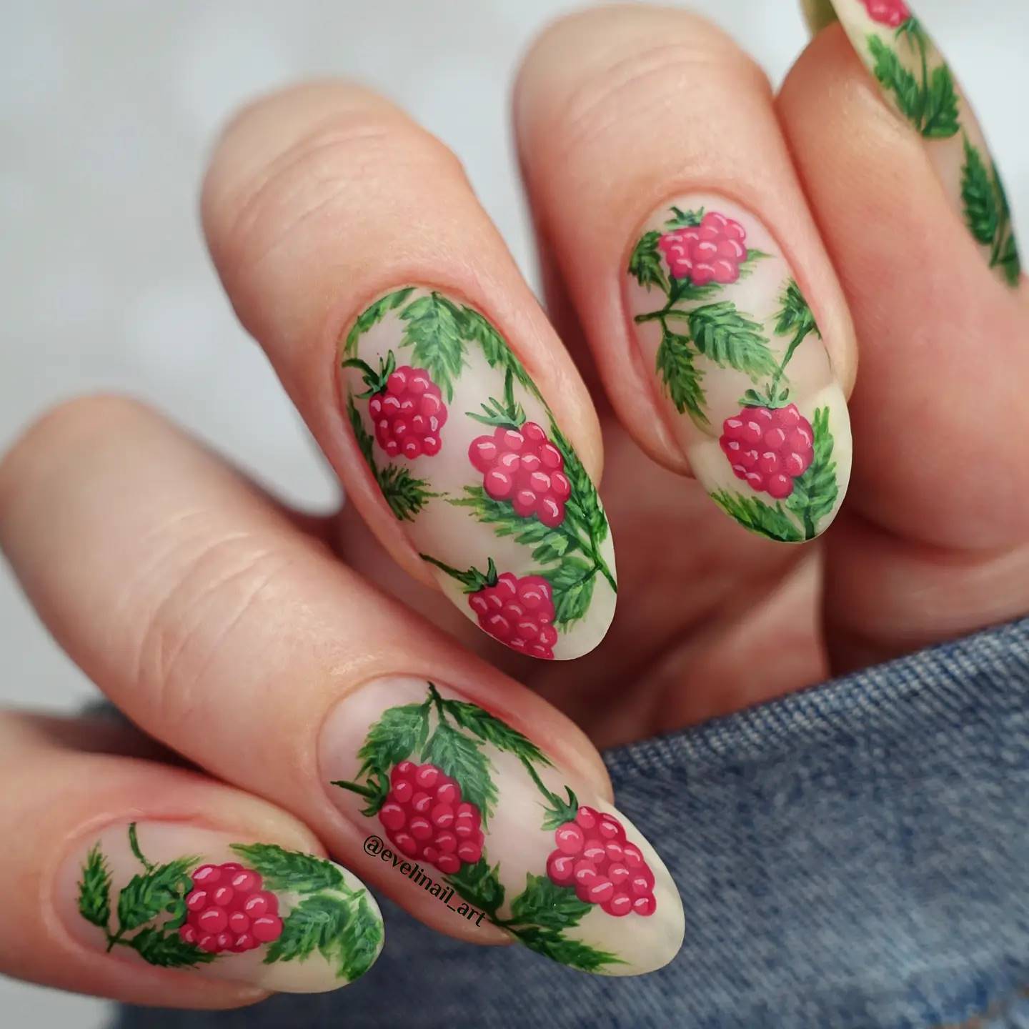 Θυμίζοντας τα κόκκινα μούρα που είναι χαρακτηριστικά αυτής της εποχής, αυτή η απόχρωση, θα σας βοηθήσει να πετύχετε ένα πολύ cool look. Μπορείτε να επιλέξετε το χρώμα των βατόμουρων για ένα μονόχρωμο μανικιούρ ή να κάνετε σχέδια βατόμουρου, όπως αυτό εδώ το απίθανο look.