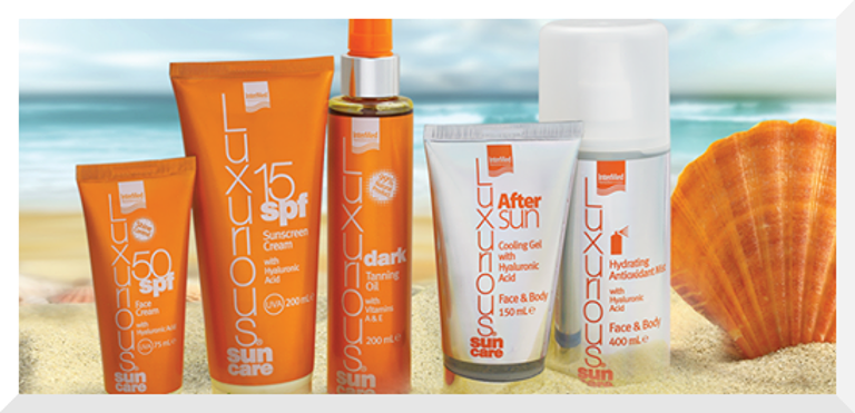 Τα LUXURIOUS SUN CARE αποτελούν την 1η ολοκληρωμένη σειρά αντηλιακών με υαλουρονικό οξύ  για τη ταυτόχρονη φυσική ανάπλαση του δέρματος από τις αθόρυβες βλάβες που προκαλεί η φωτογήρανση  & την προστασία του έναντι της πρόωρης γήρανσης.  Η πλούσια σύνθεσή τους σε δερμοπροστατευτικές βιταμίνες (βιταμίνη Α & Ε, προβιταμίνη B5) προσφέρει την απαραίτητη ενυδάτωση που έχει ανάγκη το δέρμα κατά και μετά την έκθεση στον ήλιο ακόμα & στις βαθύτερες στιβάδες της επιδερμίδας (σύνθεση που προσομοιάζει στον Φυσικό Παράγοντα Ενυδάτωσης NMF) ενώ παράλληλα δροσίζει, ανακουφίζει & καταπραΰνει από τυχόν ερεθισμούς χάρη στα εκχυλίσματα αγγουριού & χαμομηλιού που περιέχει.