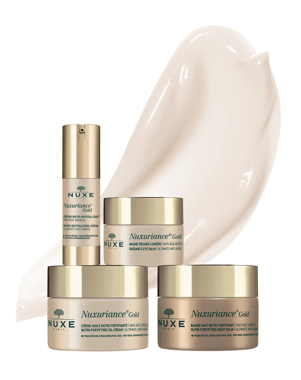 Με την ηλικία, η ανανέωση των κυττάρων του δέρματος επιβραδύνεται, η παραγωγή λιπιδίων του μειώνεται, η λειτουργία του φραγμού του διαταράσσεται και η μικροκυκλοφορία της επιδερμίδας επιβραδύνεται. Πολλές γυναίκες παρατηρούν το δέρμα τους να αλλάζει: γίνεται πιο ξηρό, πιο λεπτό, πιο εύθραυστο και η επιδερμίδα χάνει τη λάμψη της. Εδώ τα ζητούμενα είναι ξεκάθαρα: η αντιγηραντική δράση να είναι άμεση και η θρέψη, η ενδυνάμωση και η λάμψη της επιδερμίδας, πάνω απ’ όλα, ορατές! Η Nuxuriance® Gold συνδυάζει την απόλυτη εμπειρία αντιγήρανσης, η οποία επιτυγχάνεται από αποτελεσματικά προϊόντα που αποκαλύπτουν μια ανανεωμένη επιδερμίδα – ειδικά για τις γυναίκες στην περίοδο της εμμηνόπαυσης. Το δραστικό σύμπλοκο κρόκου και μπουκαμβίλιας στη σύνθεση είναι η επιτομή ενός τεχνολογικού επιτεύγματος, κατοχυρωμένου με πατέντα από το εργαστήριο της Nuxe. Το ενεργό εκχύλισμα κρόκου, μια εξαιρετικά πλούσια πηγή πολυσακχαριτών και πολυφαινολών, επωάζεται για πολλές ώρες (από 12 έως 48), κάτω από ιδιαίτερες συνθήκες, με κύτταρα μπουκαμβίλιας. Αυτά τα ευφυή φυτικά κύτταρα στοχεύουν στο βασικό στρώμα της επιδερμίδας, την περιοχή της κυτταρικής αναγέννησης του δέρματος, και απελευθερώνουν το ενεργό περιεχόμενο συνεχώς, διεγείροντας εκπληκτικά την παραγωγή νέων κύριων δερματικών κυττάρων για ένα ορατό αποτέλεσμα ανανέωσης. Η σειρά Nuxuriance Gold® αποτελείται από το Nutri-Revitalising Serum, τη Nutri-Fortifying Oil-Cream, το Nutri-Fortifying Night Balm και το Radiance Eye Balm. Τα 4 αυτά υπέροχα προϊόντα, με πάνω από 92% συστατικά φυσικής προέλευσης, είναι εμπλουτισμένα παράλληλα και με χρυσαφένιους μικροανακλαστήρες που γίνονται ένα με το δέρμα, αποκαλύπτοντας μια αξιοσημείωτη λάμψη. Εξαιρετικό και το εκλεπτυσμένο άρωμά τους, που συνδυάζει αρμονικά άνθη πορτοκαλιάς, σανδαλόξυλο και φραμπουάζ για μια αισθητηριακή εμπειρία περιποίησης.