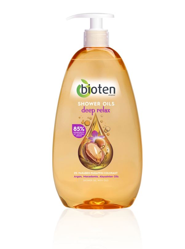 Bioten shower oil– Deep Relax: Ένα μοναδικό αφρόλουτρο που υπόσχεται να σου χαρίσει πολυτελείς στιγμές απόλαυσης, περιποίησης και φροντίδας σε κάθε μπάνιο. Χάρη στην περιποιητική του φόρμουλα φυσικής προέλευσης(κατά 85%) χαρίζει στην επιδερμίδα σου βελούδινη υφή ενώ με το Deep Relax θα μετατρέψεις ακόμα και το ντουζ των διακοπών σου σε σπα.