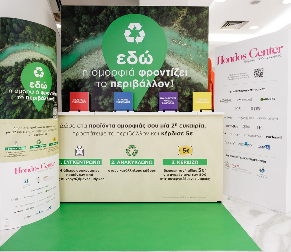 Ανακυκλώνοντας 4 άδειες συσκευασίες προϊόντων από τις συνεργαζόμενες μάρκες της L’Oréal στους κατάλληλους κάδους που έχουν τοποθετηθεί στα καταστήματα Hondos Center στην Γλυφάδα, Ομόνοια, Πειραιά (Τσαμαδού) και Σπάτα (McArthurGlen), όχι μόνο συμβάλλετε στο καλό του πλανήτη αλλά βγαίνετε και κερδισμένοι αφού σας προσφέρεται ανταποδοτικά μια δωροεπιταγή αξίας 5 ευρώ, με δυνατότητα εξαργύρωσης σε αγορές προϊόντων αξίας 50 ευρώ στις μάρκες της L’Oréal που συμμετέχουν στο πρόγραμμα.