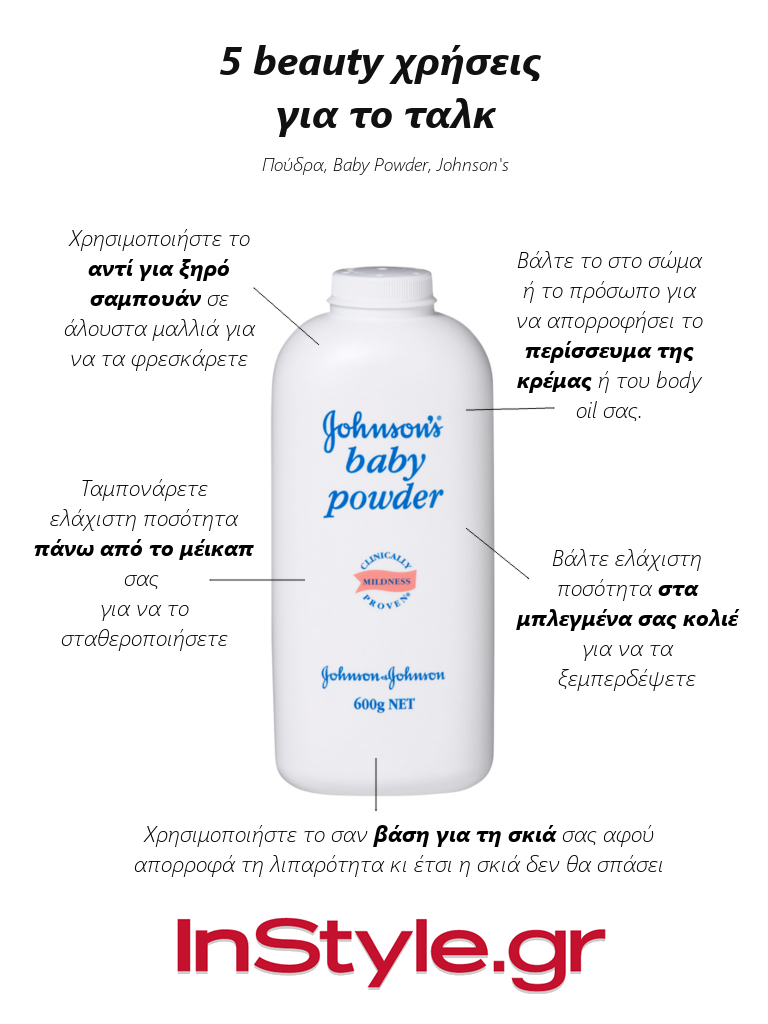 To ταλκ ή αλλιώς, η πούδρα για μωρά είναι ένα πολυχρηστικό προϊόν που κρύβεται σαν ήρεμη δύναμη στο ντουλάπι του μπάνιου ακόμα και αν δεν έχετε μωρό (ακόμα κι αν δεν σκοπεύετε να αποκτήσετε). Κάπως, κάποτε, σκεφτήκατε να το αγοράσετε και πολύ σωστά κάνατε γιατί μερικές από τις δεκάδες χρήσεις του (στην ομορφιά και το σπίτι) είναι οι παρακάτω και μπορούν να σας λύσουν τα χέρια μέρες που δεν προλαβαίνετε να λουστείτε ή όταν πιστεύετε πως τα stylish υπεράριθμα κολιέ σας έχουν συνομωτήσει με σκοπό την εξόντωσή σας μέσω πνιγμού… Διαβάστε και καλή σας ημέρα!