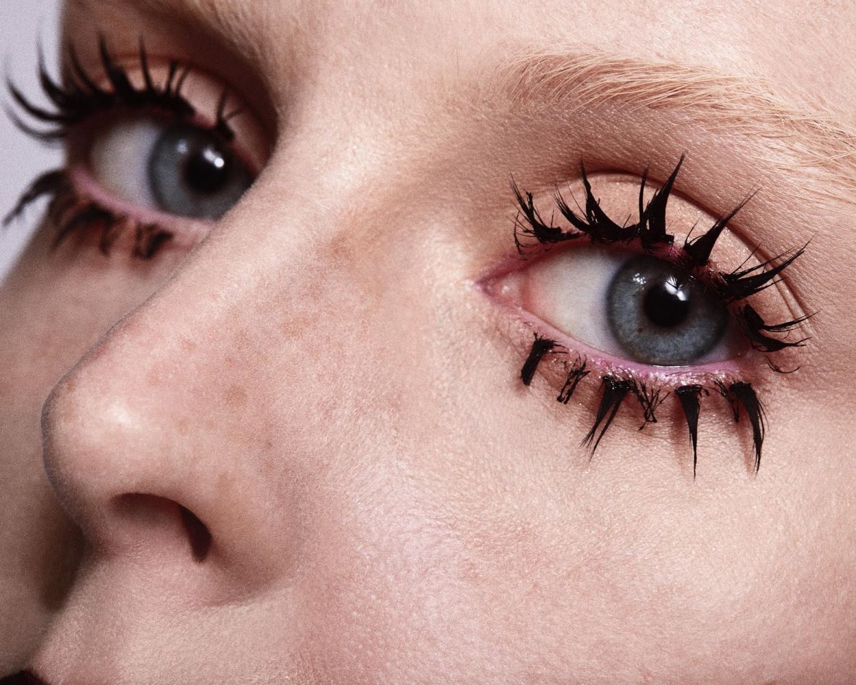 Η ματ βάση και οι τεράστιες βλεφαρίδες τύπου αράχνη με σκούρο κραγιόν εμπεριέχει τη μόδα των 60s αλλά και του goth στιλ.