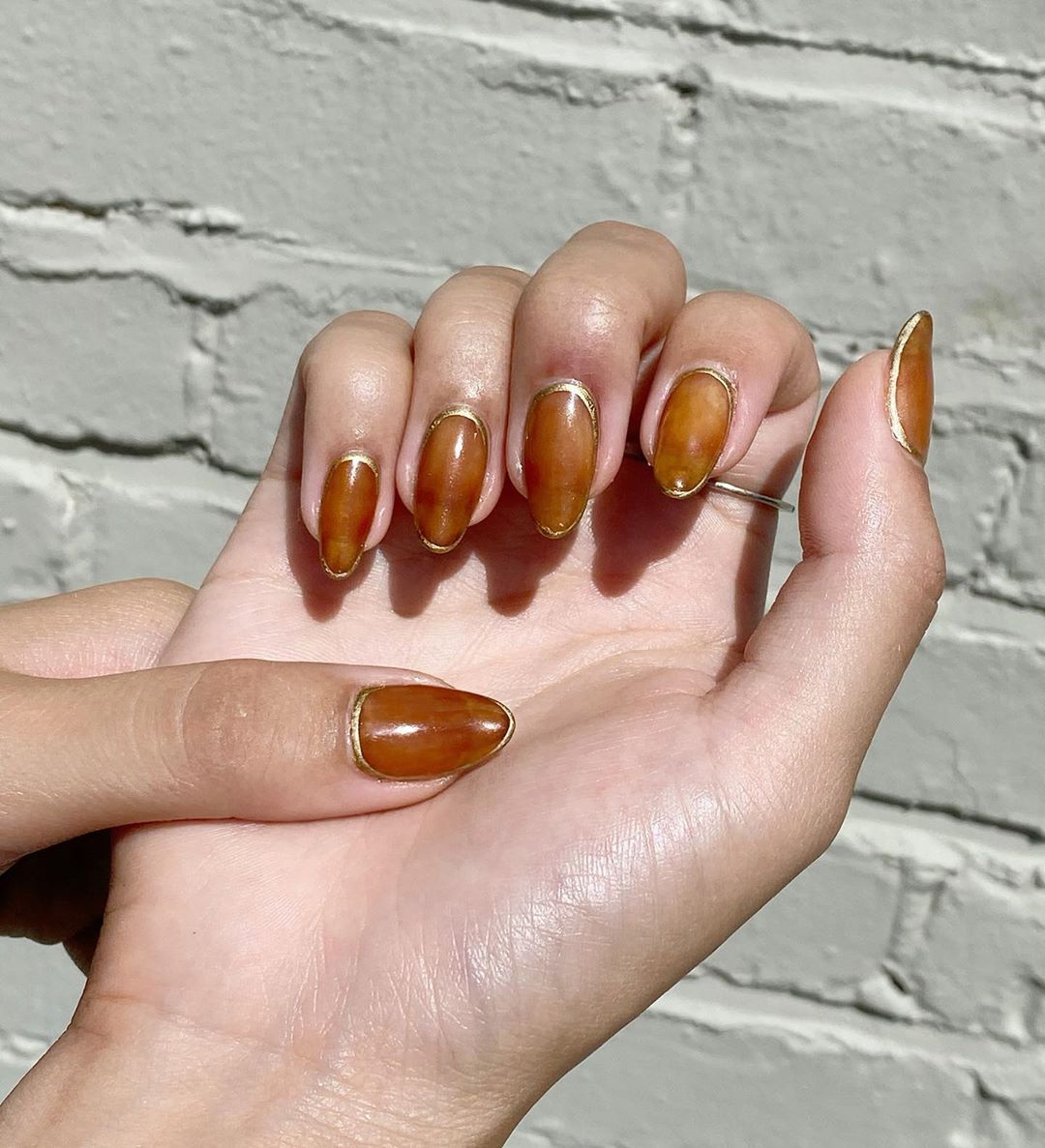 Πρόκειται για το μανικιούρ που στο εξωτερικό αναφέρεται ως gold rimmed (βλ. με χρυσό «σκελετό») και για να το δημιουργήσετε το μόνο που πρέπει να κάνετε είναι να σχεδιάσετε το περίγραμμα των νυχιών σας με ένα χρυσό βερνίκι.