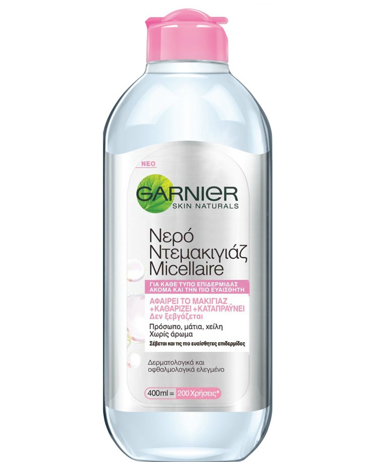 Garnier, Νερό Ντεμακιγιάζ Micellaire 3 σε 1, 6,55. Τα μικκύλια που περιέχει το συγκεκριμένο νερό καθαρισμού λειτουργούν σα μαγνήτης αφαιρώντας μακιγιάζ, ρύπους και το σμήγμα από την επιδερμίδα. Έτσι με λίγες κινήσεις, έχουμε καθαρό πρόσωπο, έτοιμο για να απλώσουμε την ενυδατική μας.