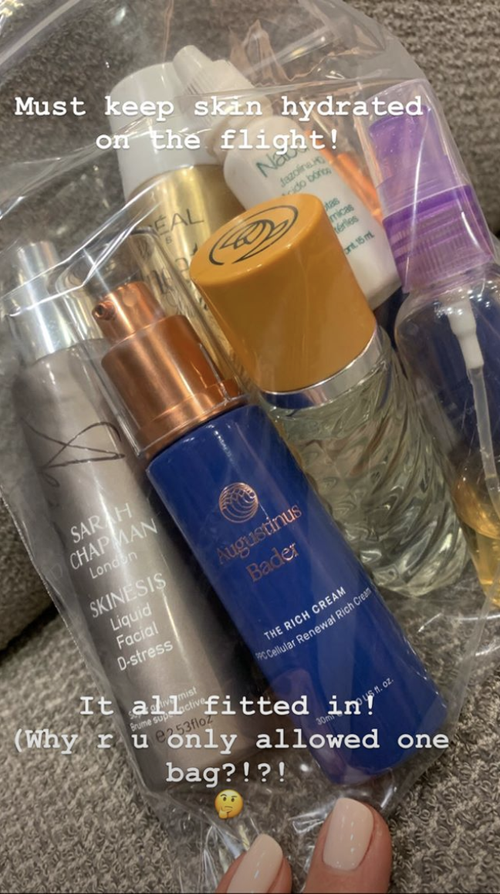 Αρκεί μια ματιά στο νεσεσέρ ταξιδιού της Victoria Beckham για να συμπεράνουμε ότι δίνει μεγάλη έμφαση στην ενυδάτωση. Και σε αυτή τη φωτό διακρίνονται τα αρκετά ενυδατικά face mists και οι κρέμες που παίρνει μαζί της στο αεροπλάνο.