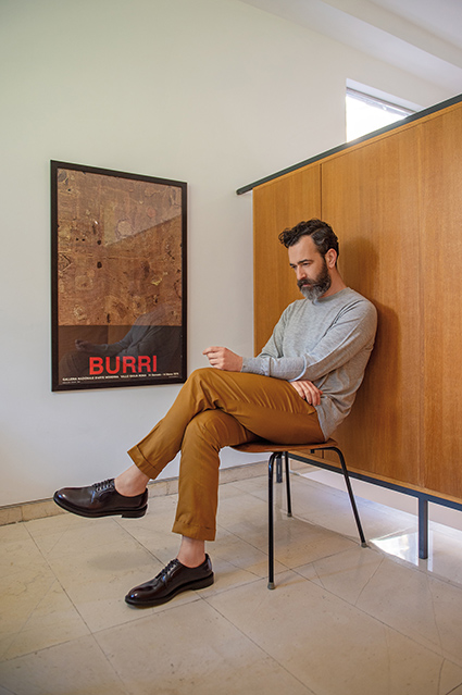 Ο Αγγελος φωτογραφήθηκε στο στούντιό του και πρώην γραφείο του γνωστού αρχιτέκτονα Ιωάννη Δεσποτόπουλου, έναν χώρο λιγότερο επηρεασμένο από την εμπλοκή του τελευταίου με τη σχολή του Bauhaus και περισσότερο σουηδικά κομψό και λιτό. Αντιλαμβάνομαι ότι ο σχεδιαστής είναι θιασώτης κάθε μορφής design, γι’ αυτό δεν γίνεται να μην τον ρωτήσω πώς νιώθει που όλα γύρω μας συγκλίνουν σε μια κοινή αισθητική και που ο «μικρός ανεξάρτητος» μένει στην απέξω αν δεν υπακούσει στους κανόνες του μαζικού καταναλωτισμού. Και κάπου εκεί η φιλοσοφική συζήτηση που ανοίγει, μας μεταφέρει στη συλλογή του, που ευφυέστατα λέγεται Stereo/Types. Πρόκειται για μια σειρά all year, ongoing, στην οποία προστίθενται συνέχεια καινούργια κομμάτια, με πάρα πολύ καλό design και casual αισθητική. «Στην πραγματικότητα, η συλλογή είναι βασισμένη σε πολύ iconic κομμάτια τα οποία είναι basic, εννοώντας ρούχα που από απόσταση μπορεί να φανούν απλά και συνήθη, αλλά όταν πλησιάσεις, θα παρατηρήσεις ότι πρόκειται για ένα πολύ ιδιαίτερο κόψιμο. Φοριούνται από το πρωί μέχρι το βράδυ, ακόμα και μέσα στο σπίτι σαν πιτζάμα. Με τα ίδια ρούχα βγαίνεις και για βόλτα – γιατί πλέον ό,τι φοράμε θέλουμε να έχει πολλές χρήσεις και να το χρησιμοποιούμε συχνά. Εμένα βέβαια το πάθος και η αγάπη μου είναι τα φορέματα, όπως ξέρεις, και όλη αυτή η πλαστικότητα, η ελευθερία, η κίνηση και το παιχνίδι του ερωτισμού».