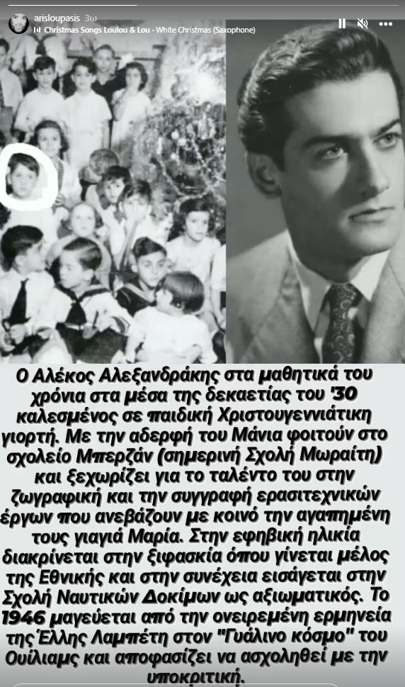 Ο δημοσιογράφος και συλλέκτης, Άρης Λουπάσης, δημοσίευσε στο Instagram μια σπάνια φωτογραφία του Αλέκου Αλεξανδράκη από τα μαθητικά του χρόνια.