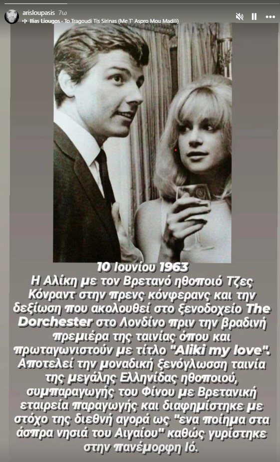 Ο δημοσιογράφος και συλλέκτης, Άρης Λουπάσης, δημοσίευσε στο Instagram μια σπάνια φωτογραφία, στην οποία βλέπουμε την Αλίκη Βουγιουκλάκη με τον Βρετανό ηθοποιό Jess Conrad στο Λονδίνο το 1963.
