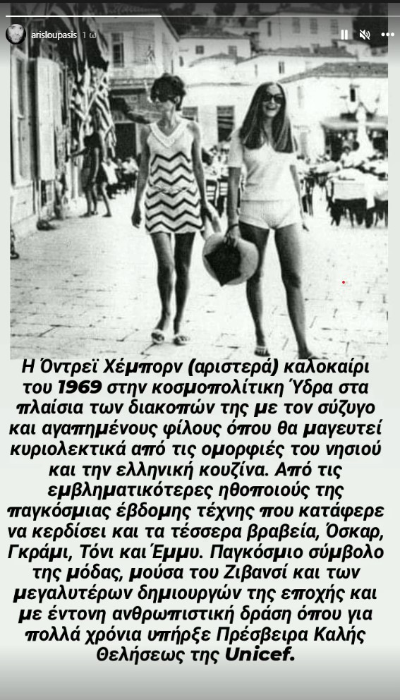 Ο δημοσιογράφος και συλλέκτης, Άρης Λουπάσης, δημοσίευσε στον προσωπικό του λογαριασμό στο Instagram μια σπάνια φωτογραφία από τις διακοπές της Audrey Hepburn στην Ελλάδα το 1969 και συγκεκριμένα στην Ύδρα.