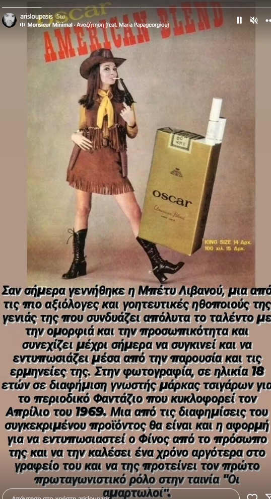 Ξεχωριστή είναι η σημερινή μέρα για την Μπέτυ Λιβανού, καθώς έχει γενέθλια. Συγκεκριμένα η γοητευτική ηθοποιός κλείνει τα 73. Με αφορμή, λοιπόν, τα γενέθλιά της ο δημοσιογράφος και συλλέκτης, Άρης Λουπάσης, δημοσίευσε στο Instagram μια σπάνια φωτογραφία της. Όπως αναφέρει η 18χρονη τότε Μπέτυ Λιβανού διαφημίζει γνωστή μάρκα τσιγάρων.