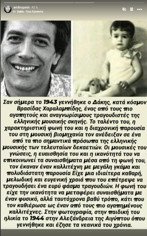 “Σαν σήμερα το 1943 γεννήθηκε ο Δάκης, κατά κόσμον Βρασίδας Χαραλαμπίδης, ένας από τους πιο αγαπητούς και αναγνωρίσιμους τραγουδιστές της ελληνικής μουσικής σκηνής. Το ταλέντο του, η χαρακτηριστική φωνή του και η διαχρονική παρουσία του στη μουσική βιομηχανία τον ανέδειξαν σε ένα από τα πιο σημαντικά πρόσωπα της ελληνικής μουσικής των τελευταίων δεκαετιών.