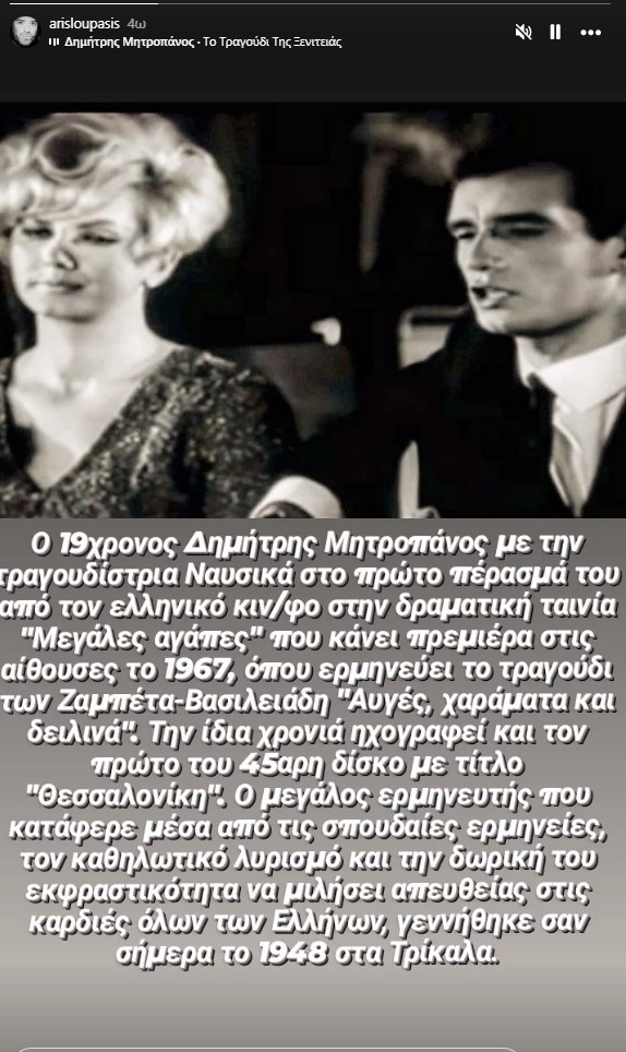 Ο 19χρονος Δημήτρης Μητροπάνος με την τραγουδίστρια Ναυσικά στο πρώτο πέρασμά του από τον ελληνικό κινηματογράφο στη δραματική ταινία “Μεγάλες αγάπες” που κάνει πρεμιέρα στις αίθουσες το 1967, όπου ερμηνεύει το τραγούδι των Ζαμπέτα-Βασιλειάδη “Αυγές, χαράματα και δειλινά”.