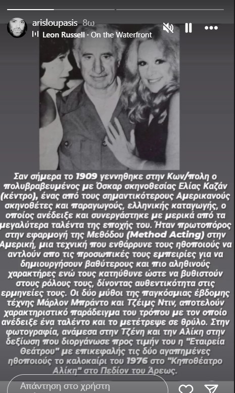 Σαν σήμερα γεννήθηκε το 1909 στην Κωνσταντινούπολη ο ελληνικής καταγωγής σπουδαίος σκηνοθέτης Ελία Καζάν. Με αφορμή τη συμπλήρωση 115 ετών από τη γέννησή του, ο δημοσιογράφος και συλλέκτης Άρης Λουπάσης δημοσίευσε στο Instagram μια σπάνια φωτογραφία, στην οποία ποζάρει με την Αλίκη Βουγιουκλάκη και την Τζένη Καρέζη το 1976.