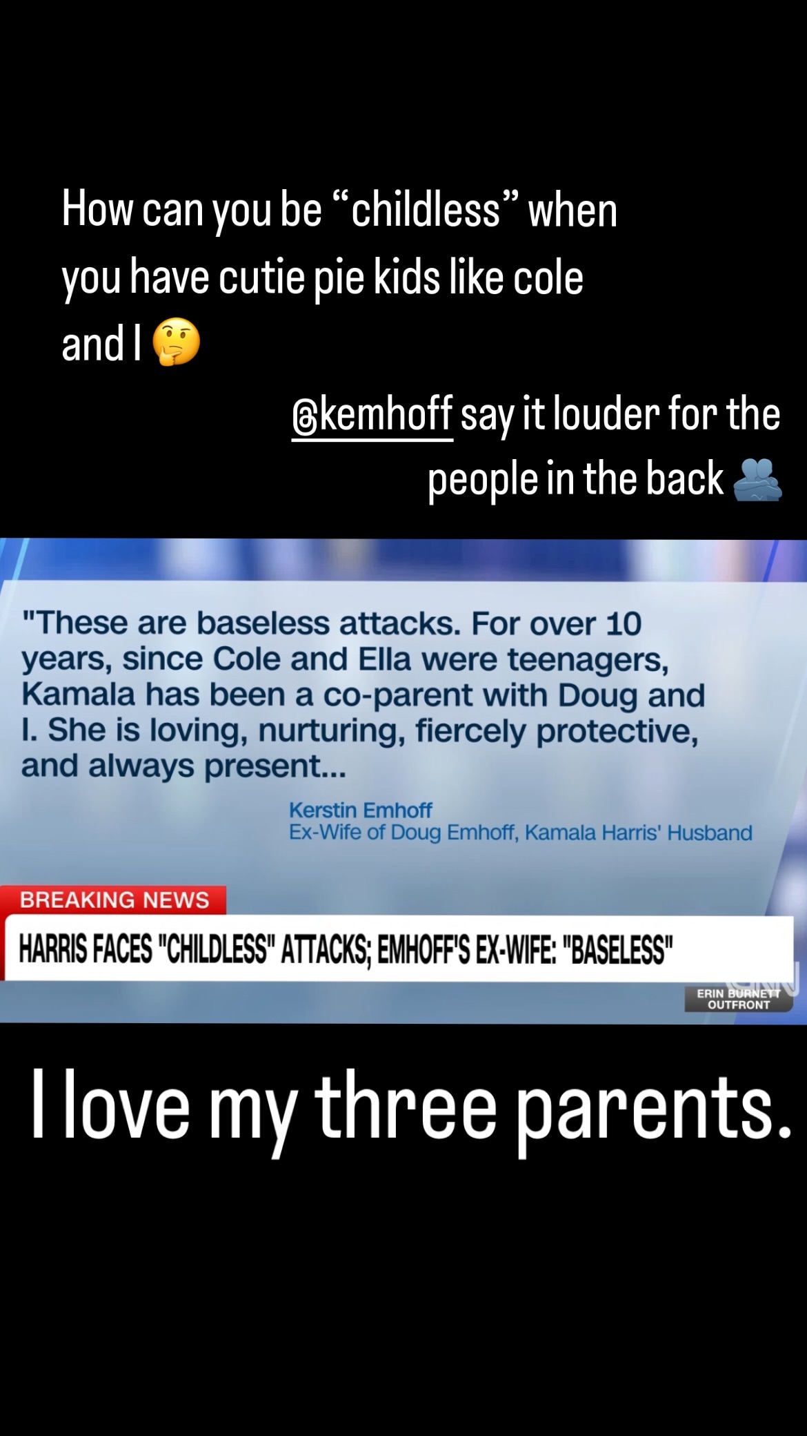 Η 25χρονη κόρη του συζύγου της Harris, Doug Emhoff, και της πρώην συζύγου του, Kerstin Emhoff, κατακεραύνωσε τον γερουσιαστή ανεβάζοντας ενα Insta Story όπου έδωσε την απάντησή της: “Πώς μπορείς να είσαι “άτεκνος” όταν έχεις χαριτωμένα παιδιά σαν τον Cole και εμένα;” έγραψε αναφερόμενη στην ίδια και τον 29χρονο αδελφό της, Cole Emhoff.