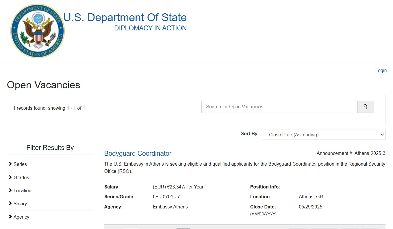 Η πρεσβεία των ΗΠΑ στην Αθήνα έχει ανεβάσει αγγελία στο site σύμφωνα με την οποία αναζητείται συντονιστής σωματοφυλάκων και δέχεται κατάθεση βιογραφικών έως τις 29 Μαΐου. Συγκεκριμένα, όπως αναφέρεται στην αγγελία: “Η Πρεσβεία των ΗΠΑ στην Αθήνα αναζητά κατάλληλους και καταρτισμένους υποψηφίους για τη θέση του Συντονιστή σωματοφυλάκων στο Περιφερειακό Γραφείο Ασφαλείας (RSO).”