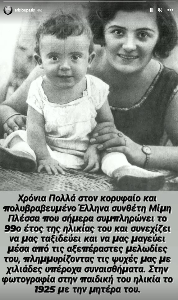 “Χρόνια πολλά στον κορυφαίο και πολυβραβευμένο Έλληνα συνθέτη Μίμη Πλέσσα που σήμερα συμπληρώνει το 99ο έτος της ηλικίας του και συνεχίζει να μας ταξιδεύει και να μας μαγεύει μέσα από τις αξεπέραστες μελωδίες του, πλημμυρίζοντας τις ψυχές μας με χιλιάδες υπέροχα συναισθήματα. Στη φωτογραφία στην παιδική του ηλικία το 1925 με τη μητέρα του”.