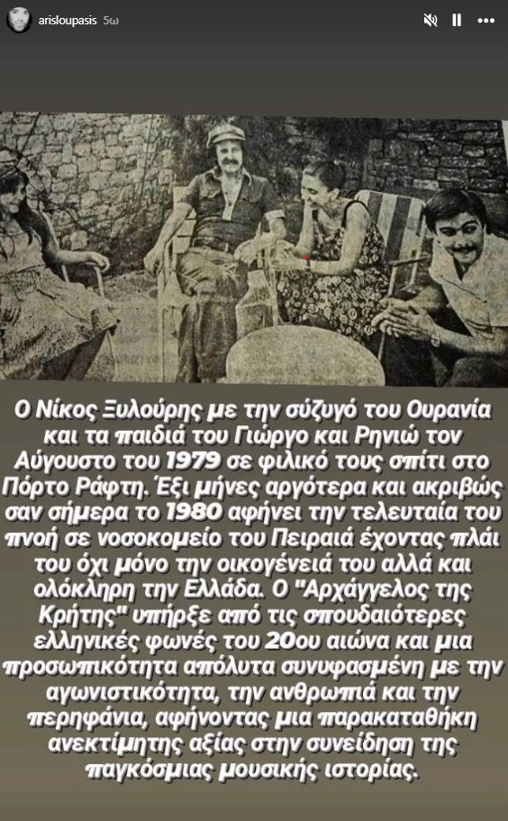 “Ο Νίκος Ξυλούρης με τη σύζυγό του Ουρανία και τα παιδιά του Γιώργο και Ρηνιώ τον Αύγουστο του 1979 σε φιλικό τους σπίτι στο Πόρτο Ράφτη. Έξι μήνες αργότερα και ακριβώς σαν σήμερα το 1980 αφήνει την τελευταία του πνοή σε νοσοκομείο του Πειραιά έχοντας δίπλα του όχι μόνο την οικογένειά του, αλλά και ολόκληρη την Ελλάδα.