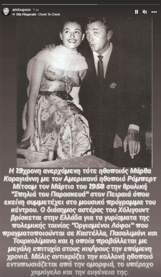Ο δημοσιογράφος και συλλέκτης, Άρης Λουπάσης, δημοσίευσε στον προσωπικό του λογαριασμό στο Instagram μια σπάνια φωτογραφία της Μάρθας Καραγιάννη με τον Robert Mitchum. Η αξέχαστη ηθοποιός ήταν τότε μόλις 19 ετών και βρισκόταν ουσιαστικά στο ξεκίνημα της καριέρας της. Με την ομορφιά της και το χαμόγελό της εντυπωσίασε τον διάσημο αστέρα του Χόλιγουντ.