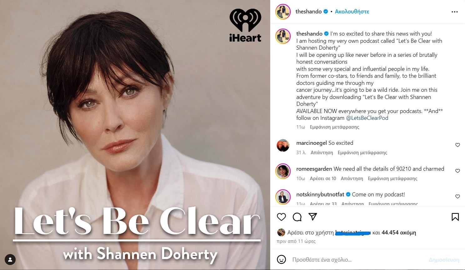 Το οκταετές ταξίδι της Doherty με τον καρκίνο την έχει οδηγήσει στο να προβληματιστεί για τη μεγάλη εικόνα της ζωής της. Ένα θέμα που θα εξερευνήσει στο podcast της σε στιλ απομνημονευμάτων, Let’s Be Clear with Shannen Doherty.