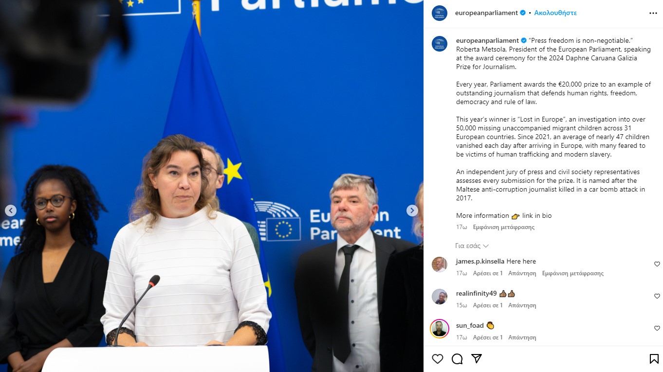 Tο Βραβείο Δημοσιογραφίας Daphne Caruana Galizia 2024 απονεμήθηκε στην έρευνα «Lost in Europe» με θέμα την εξαφάνιση περισσότερων από 50.000 ασυνόδευτων παιδιών.