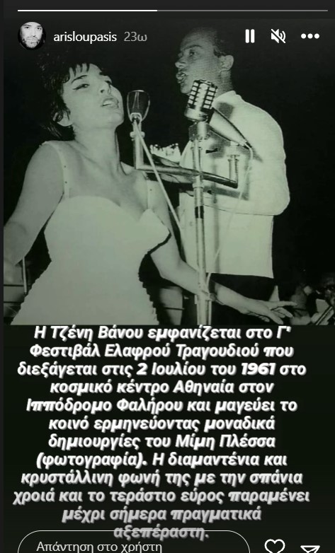 Ο δημοσιογράφος και συλλέκτης, Άρης Λουπάσης, δημοσίευσε στον προσωπικό του λογαριασμό στο Instagram μια σπάνια φωτογραφία, στην οποία η 22χρονη τότε Τζένη Βάνου εμφανίζεται στο Γ΄ Φεστιβάλ Ελαφρού Τραγουδιού στις 2 Ιουλίου του 1961.