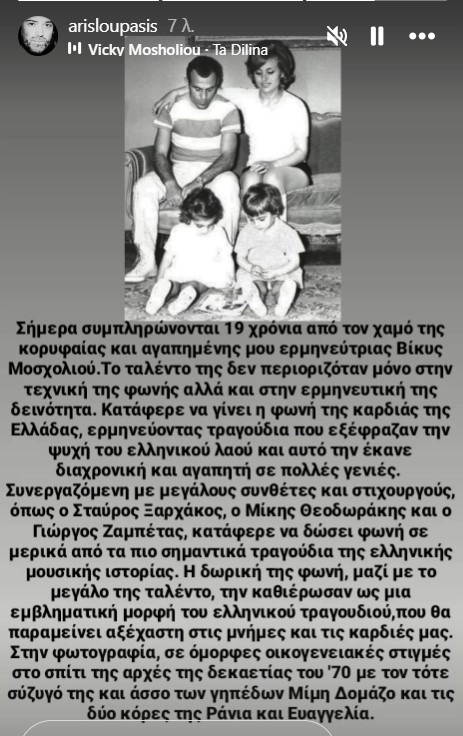 Η Βίκυ Μοσχολιού έφυγε από τη ζωή σαν σήμερα το 2005 σε ηλικία 62 ετών έπειτα από άνιση μάχη με τον καρκίνο. Με αφορμή τη συμπλήρωση 19 ετών από τον θάνατο της σπουδαίας τραγουδίστριας, ο δημοσιογράφος και συλλέκτης, Άρης Λουπάσης δημοσίευσε στο Instagram μια σπάνια φωτογραφία της στις αρχές της δεκαετίας του ’70, όπου ποζάρει με τον τότε σύζυγό της, Μίμη Δομάζο στο σπίτι τους μαζί με τις κόρες του Ράνια και Ευαγγελία.