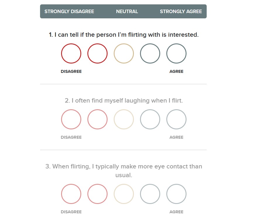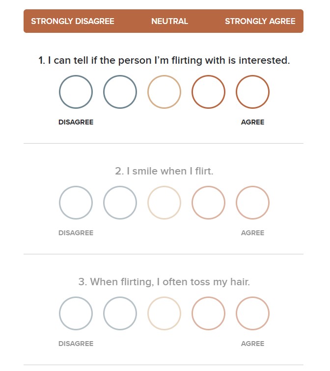 Το Psychology Today έχει δημιουργήσει δύο εκδοχές του τεστ φλερτ, μία για άνδρες και μία για γυναίκες. Και τα δύο τεστ περιλαμβάνουν 20 δηλώσεις, με τους συμμετέχοντες να καλούνται να απαντήσουν κατά πόσο συμφωνούν ή διαφωνούν με αυτές.